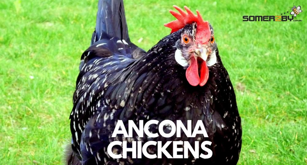 The Ancona chicken is most recognisable by its black feathers with a beetle green sheen. Each black feather has a small white tip on the end.